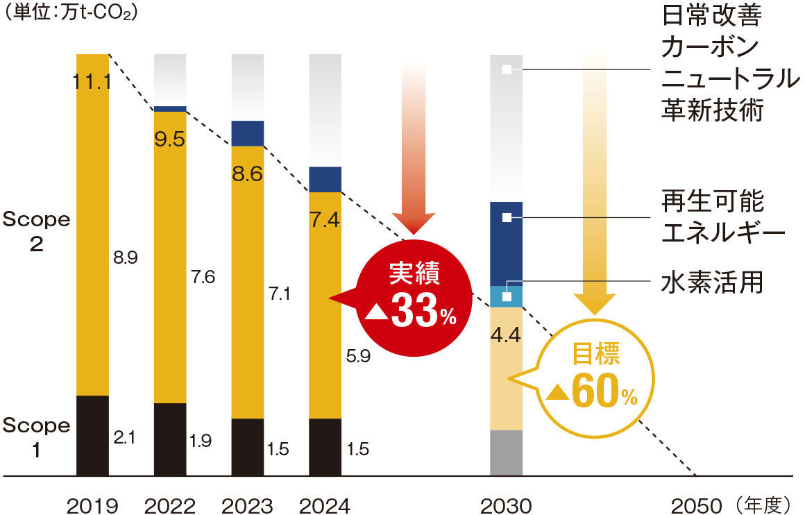 2030年までにScope1・Scope2の排出量を2019年度比で60%削減する目標を設定し、着実な実行を進めています。