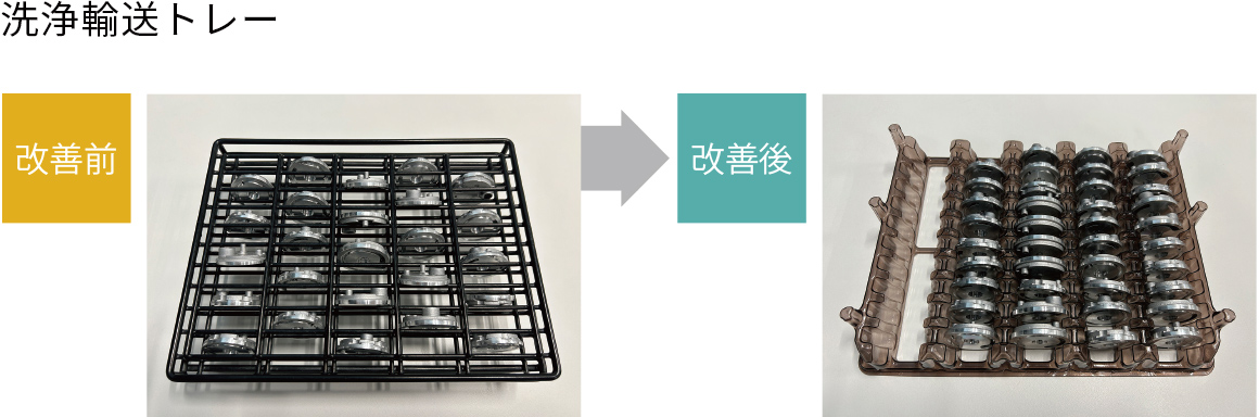 当社の「ものづくり改善」メンバーと「物流・梱包」メンバーが、仕入先の困りごとに対し、協働活動によって、洗浄と輸送の兼用トレーを開発しました。兼用トレーの開発により①洗浄エネルギーの半減(従来収容量が倍増) ②洗浄後詰替作業の省略 ③箱収容数増による運搬効率向上が実現されました。