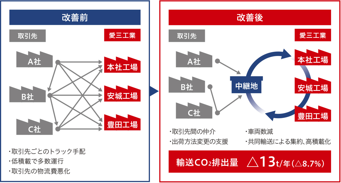 以前は取引先ごとにトラックを手配し、製品輸送を行っていました。個社対応により積載率が上がらず、取引先の物流効率が悪化する要因となっていたことから、輸送会社に協力いただき中継地を設置し、物流ルートを集約しました。年間輸送CO2排出量を13t削減(8.7%減)するとともに、共同輸送によりトラックの積載率が大きく改善しました。
