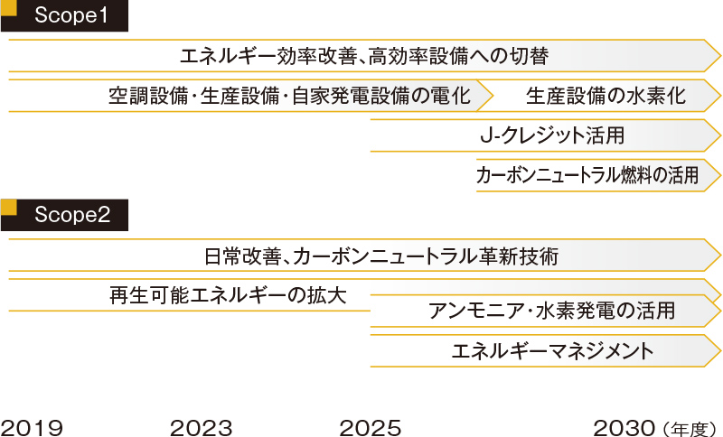 日常改善によるエネルギー効率改善、ものづくりにおける生産技術革新を通じて徹底的なエネルギー削減を進めるとともに、太陽光発電などの再生可能エネルギーや当社が開発を進めるアンモニア・水素発電を活用し、化石燃料からの脱却に貢献していきます。