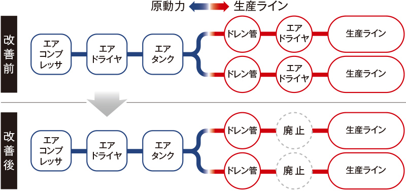 工場圧縮エアー由来のCO2排出量削減活動を実施していく中で、生産ラインの直前に設置している個別エアドライヤの廃止を実施しました。エアー温度と露点データを収集し、設置基準を明確にすることで、現場の不安を解消するとともに設置の必要性を整理しました。結果、年間150tのCO2排出量削減を達成しました。