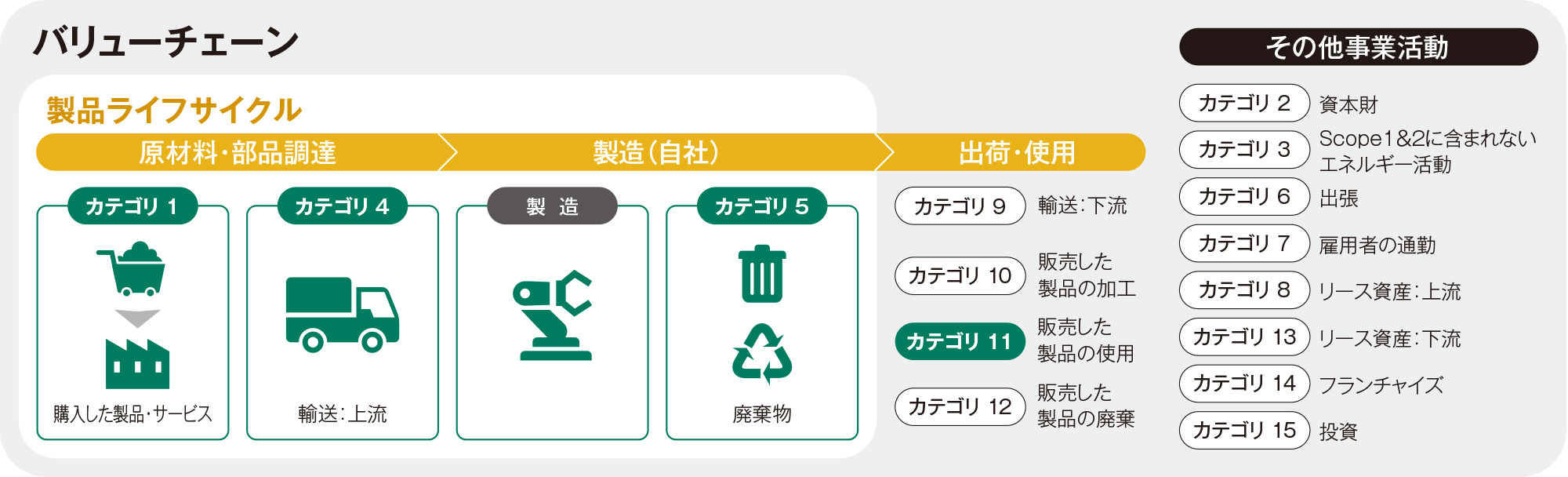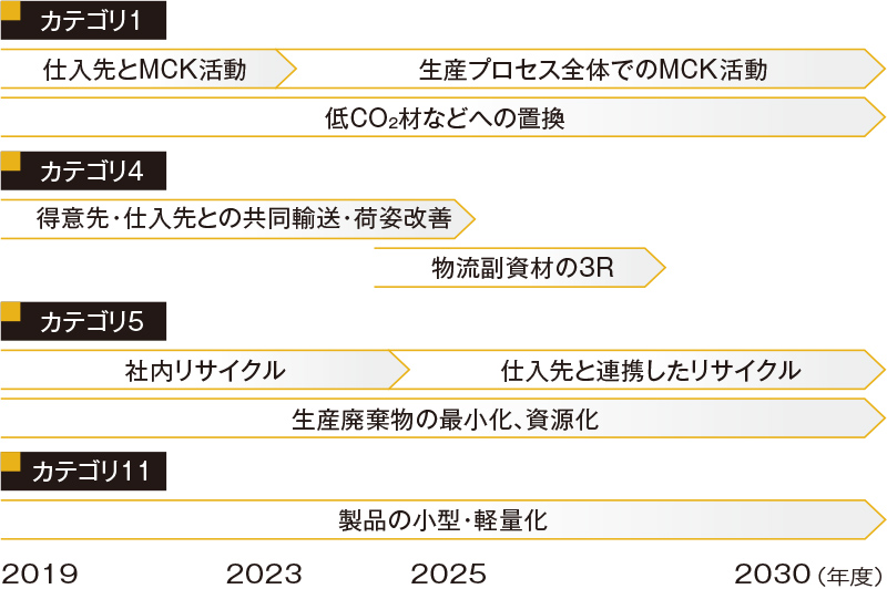 当社はScope3において、2019年度比で28%の削減を目標に掲げて取り組んでいます。特に当社の製品ライフサイクルCO2に該当するカテゴリ1・4・5と排出量の多いカテゴリ11に注力し、MCK活動を通じてCO2排出量の見える化と削減に取り組んでいます。