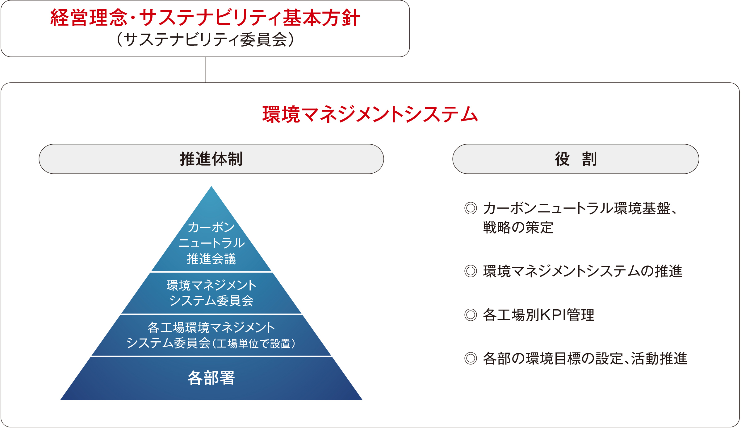 当社は1999年よりISO14001認証を継続取得し、確立した環境マネジメントシステムを基盤に全社的な環境活動を推進しています。サステナビリティ委員会の下部組織であるカーボンニュートラル委員会にて環境関連の方針策定やKPI管理をすることにより、経営層の意思決定を迅速かつ確実に環境活動へ反映し、経営体制と連動した環境ガバナンスを構築しています。
