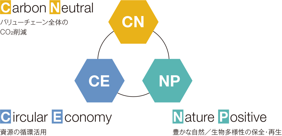 当社は、「カーボンニュートラル」「サーキュラーエコノミー」「ネイチャーポジティブ」の3つを環境活動の柱と位置づけています。