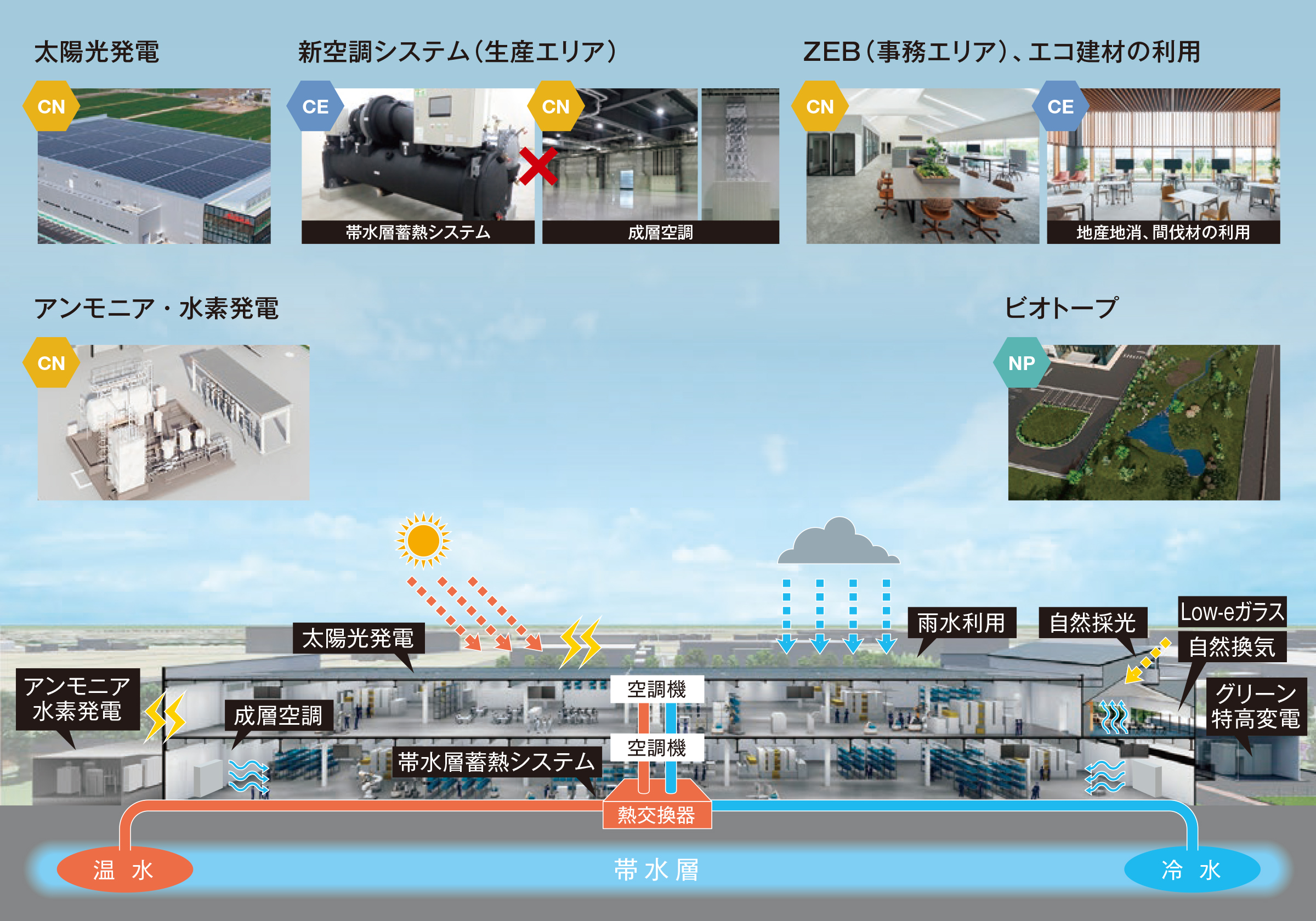 当社の環境活動における3本柱である「カーボンニュートラル」「サーキュラーエコノミー」「ネイチャーポジティブ」を実現する新たな工場として「Aisanみらい工場」を整備しました。生産エリアにおいては、帯水層蓄熱システムと成層空調システムを組み合わせた新空調システムを導入し、省エネと快適な作業環境の両立を図るとともに、ものづくりの観点では、生産効率を高めることで徹底的な省エネを実現します。また、必要なエネルギーは、太陽光発電やアンモニア・水素発電をはじめとするクリーンエネルギーでまかなう設計にしています。これらの取り組みにより事務エリアではZEB認証を取得しました。さらに、自然再興を推進するため、既存工場の間伐木材や地元産木材を活用した地産地消の取り組み、地域の自然を再現したビオトープを整備しています。