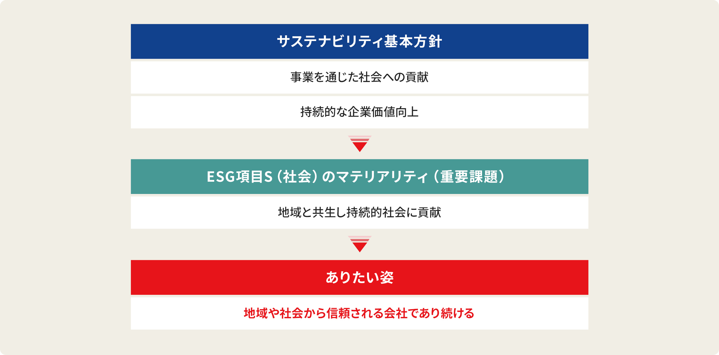 サステナビリティ基本方針に基づき、経営層がESG分野全般の方向性と適正性を包括的にマネジメントレビューするため、2022年4月にサステナビリティ委員会を設置しました。2025年7月には、外部環境の変化や内部運用の効率化を踏まえ、会議体の構成と運営フローを見直し、より効率的で機能的な体制へと改編しました。