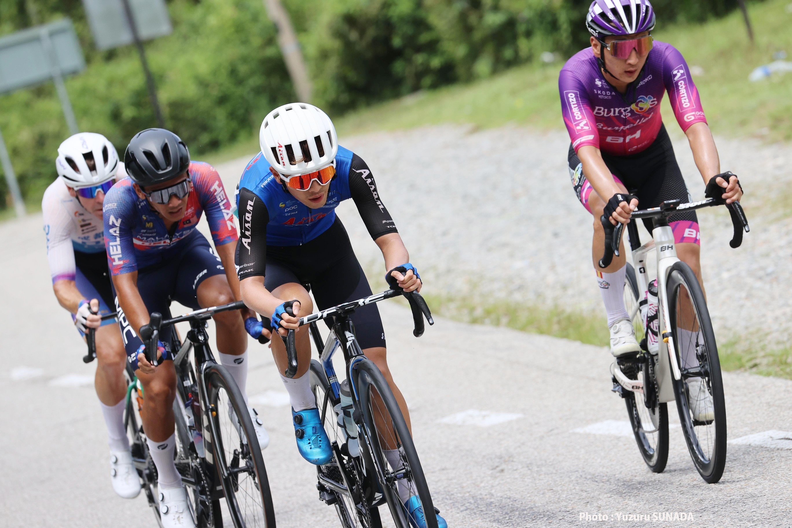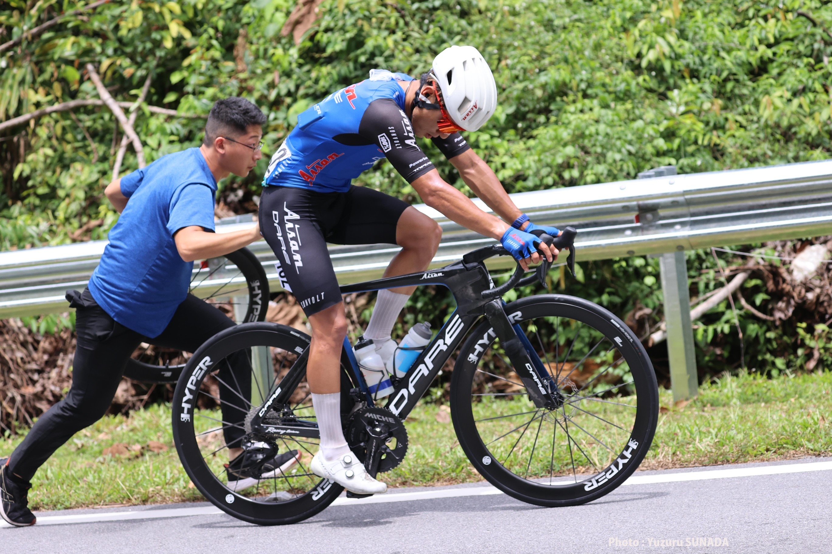 スタート直後からアタック合戦が繰り広げられ、力のあるプロチームの選手も積極的に動きます。そんな中、加藤選手が3名と共に飛び出して逃げ集団を形成。必死に追いかける集団を尻目にうまくペースを刻み、一時は30秒近くの差を広げました。「プロチームの選手も動いていてペースは速かったが、自分が動けるタイミングで行ってやろうと思って動いた」と語った加藤選手。6月上旬のTour de Gyeongnamでも力を要する場面で良い動きを見せており、まだ数字としての結果にはつながっていないものの、成長の兆しを示しています。結果的にその逃げは決定的とはならず、その後に飛び出した5人の逃げが長い上りに入る前に決まり、メイン集団は安定。そのペースでも多くの選手が遅れ、昨日のステージを制したTudor Pro Cycling TeamのDe Kleijn選手も脱落。一方で、草場選手は最初の上りでメカトラの影響により脚を使い、1級山岳で遅れてしまいました。さらに、平坦ステージで上位に入っていた選手数名も脱落し、70名ほどに絞られたメイン集団は、その合流を許さないままフィニッシュまで残り100kmはペースが緩むことはありませんでした。