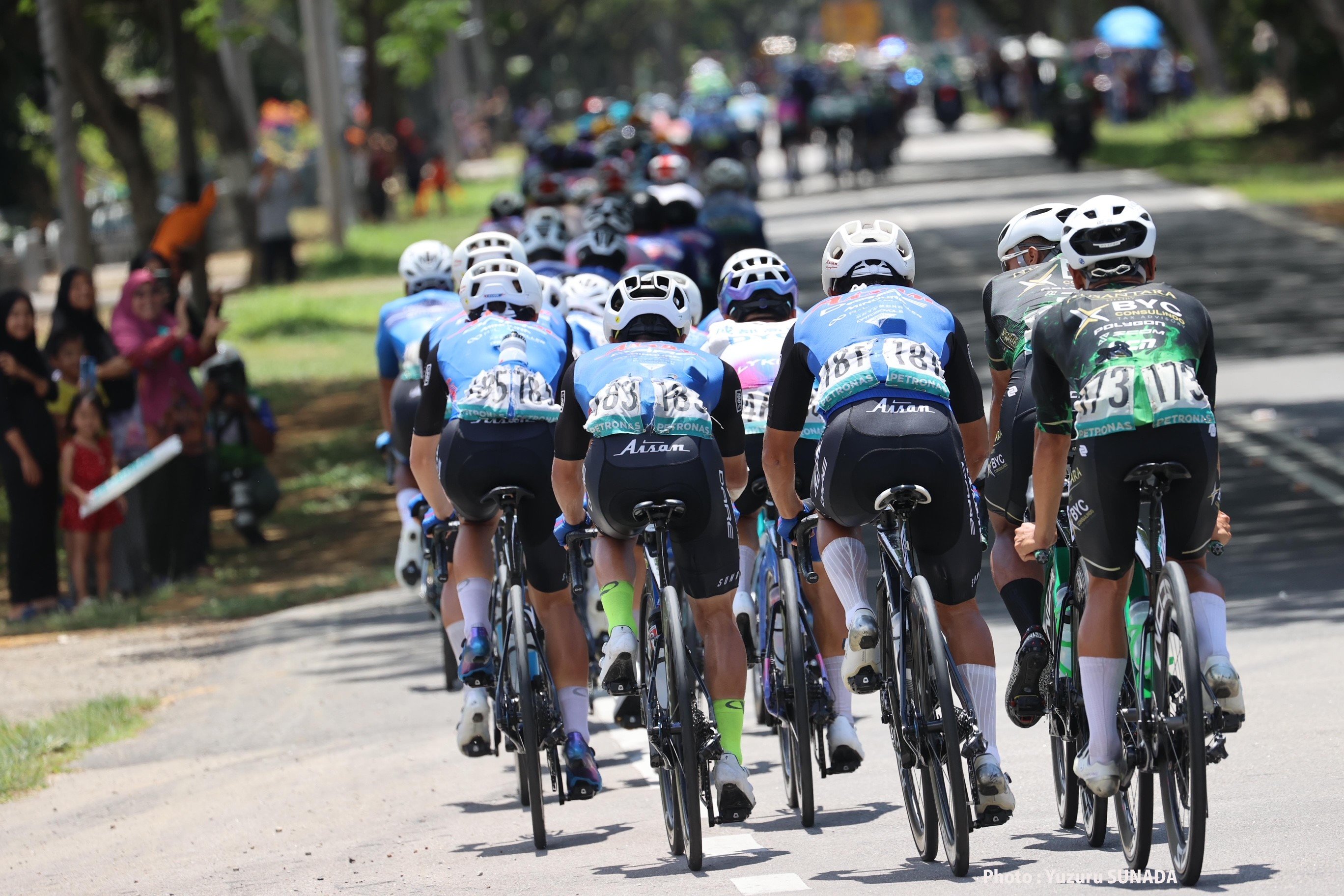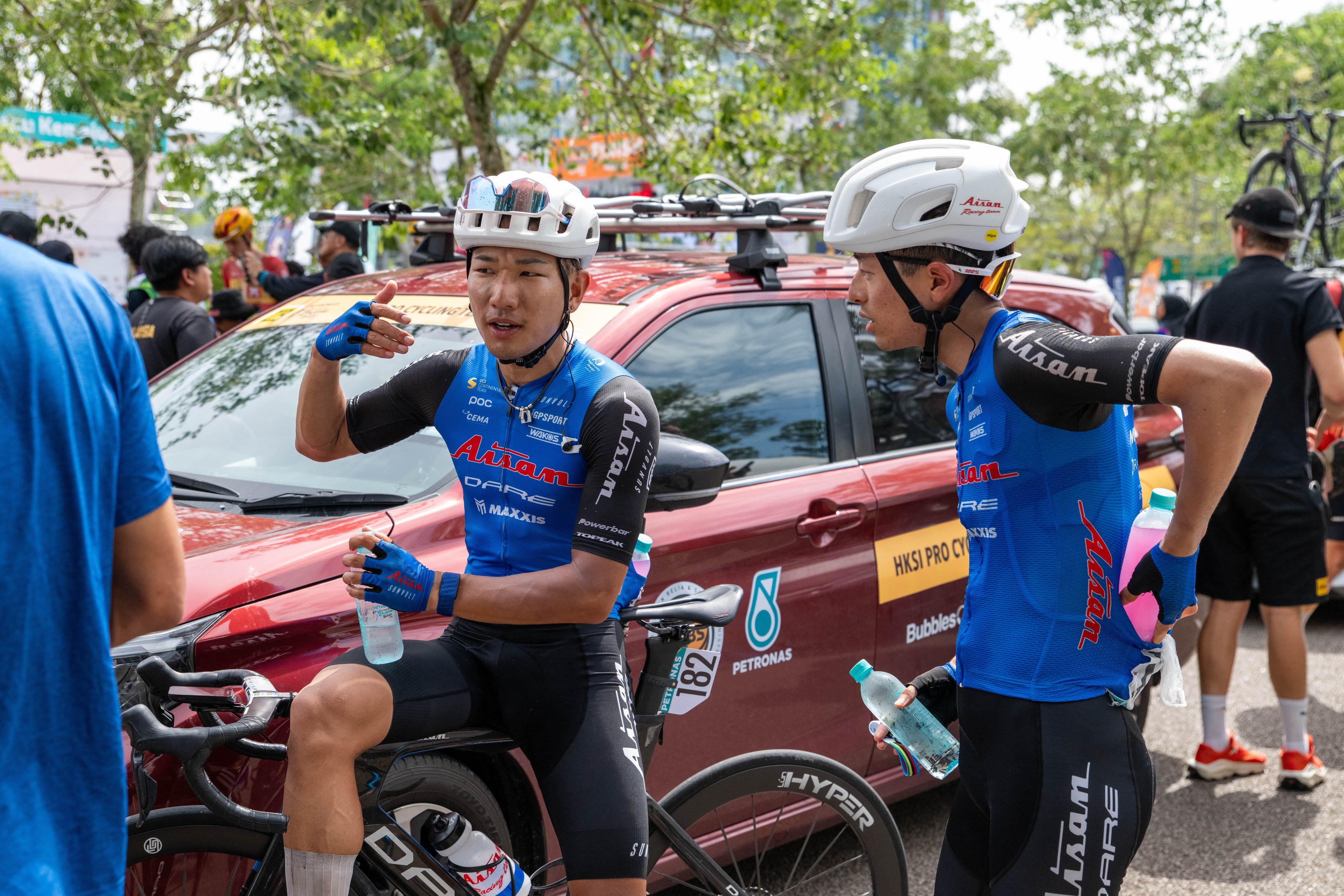 序盤は危険な逃げができそうな場面では草場選手、加藤選手、松井選手が対応し、それ以外は見送り。加藤選手と松井選手はチームカーからボトルや氷を積極的に運び、チームをサポートしました。 しかしスプリントに備えていた岡本選手が走行中に嘔吐するなど体調を崩してしまいます。ドクターカーから薬を受け取ったものの万全ではなく、急遽草場選手のスプリントに切り替える展開となりました。その間も逃げ集団は協調して進み、特にマレーシアチャンピオンジャージを着るTerengganu Cycling TeamのRosli選手が積極的にペースを作り続けます。差をうまく保ったまま逃げは持続し、残り30秒差で逃げ切り濃厚。ここに独走で追いついたUnibet Tietema RockeysのKyffin選手との一騎打ちとなり、Kyffin選手が優勝しました。 一方、メイン集団の3位争いスプリントでは草場選手が粘り、16位でフィニッシュしました。 明日は最終日。例年の平坦フィニッシュとは異なり、180kmにわたり激しいアップダウンが続く厳しいコースです。個人総合の順位が再び大きく動く可能性もあり、最後までチーム全員で最善を尽くして戦います。